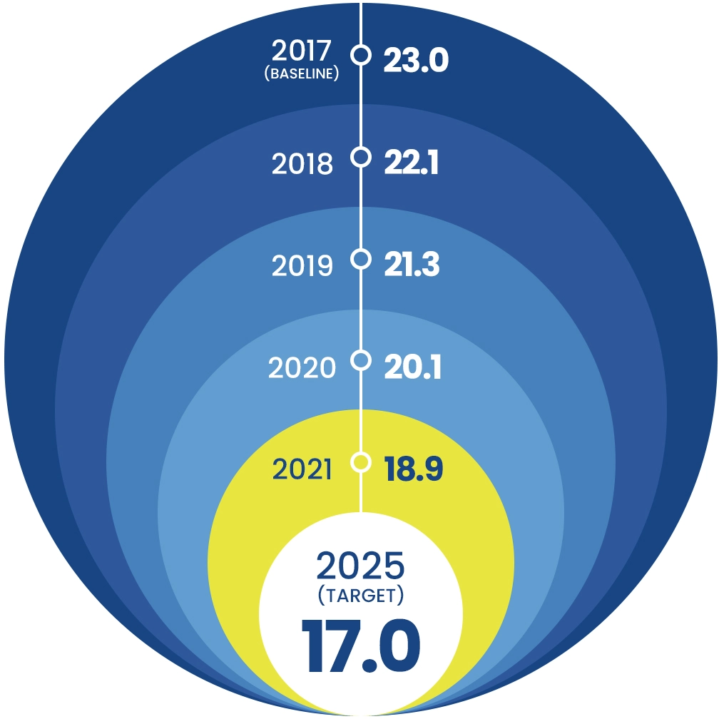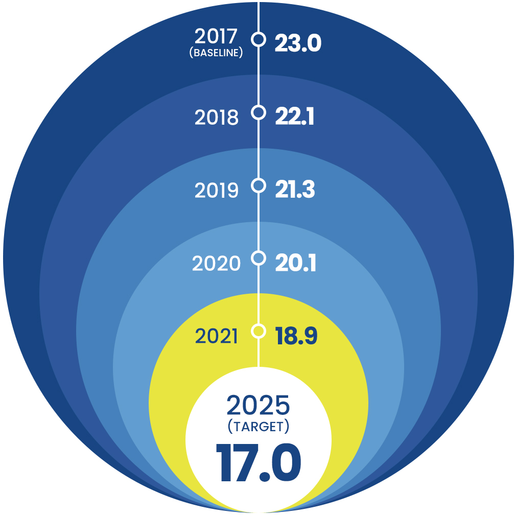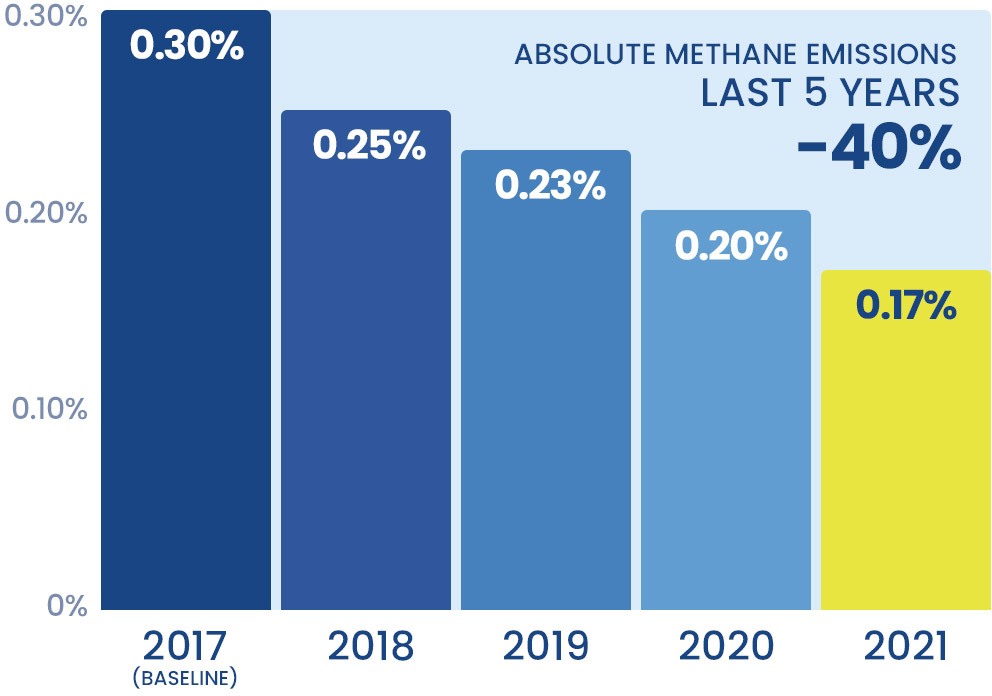 OGCI member companies’ aggregate methane intensity is now 0.17%, in the range of the current 2025 target of well below 0.20%4. Importantly, this improvement in intensity has translated into a 40% decrease in absolute upstream methane emissions over the five-year period. The fall in absolute methane emissions continued in 2021, even as member companies’ natural gas production increased.
