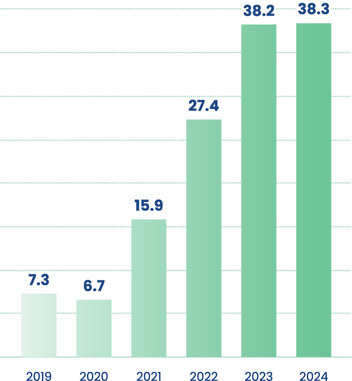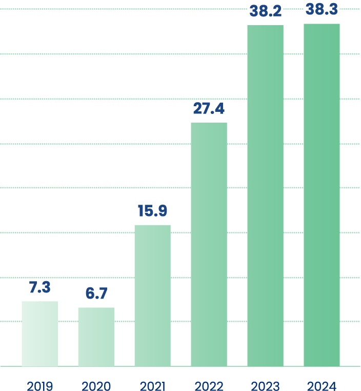 In 2024, CI portfolio companies generated 38.3Mt of GHG impact – this was a small increase in total GHG impact against 2023. The underlying drivers of this trend are: